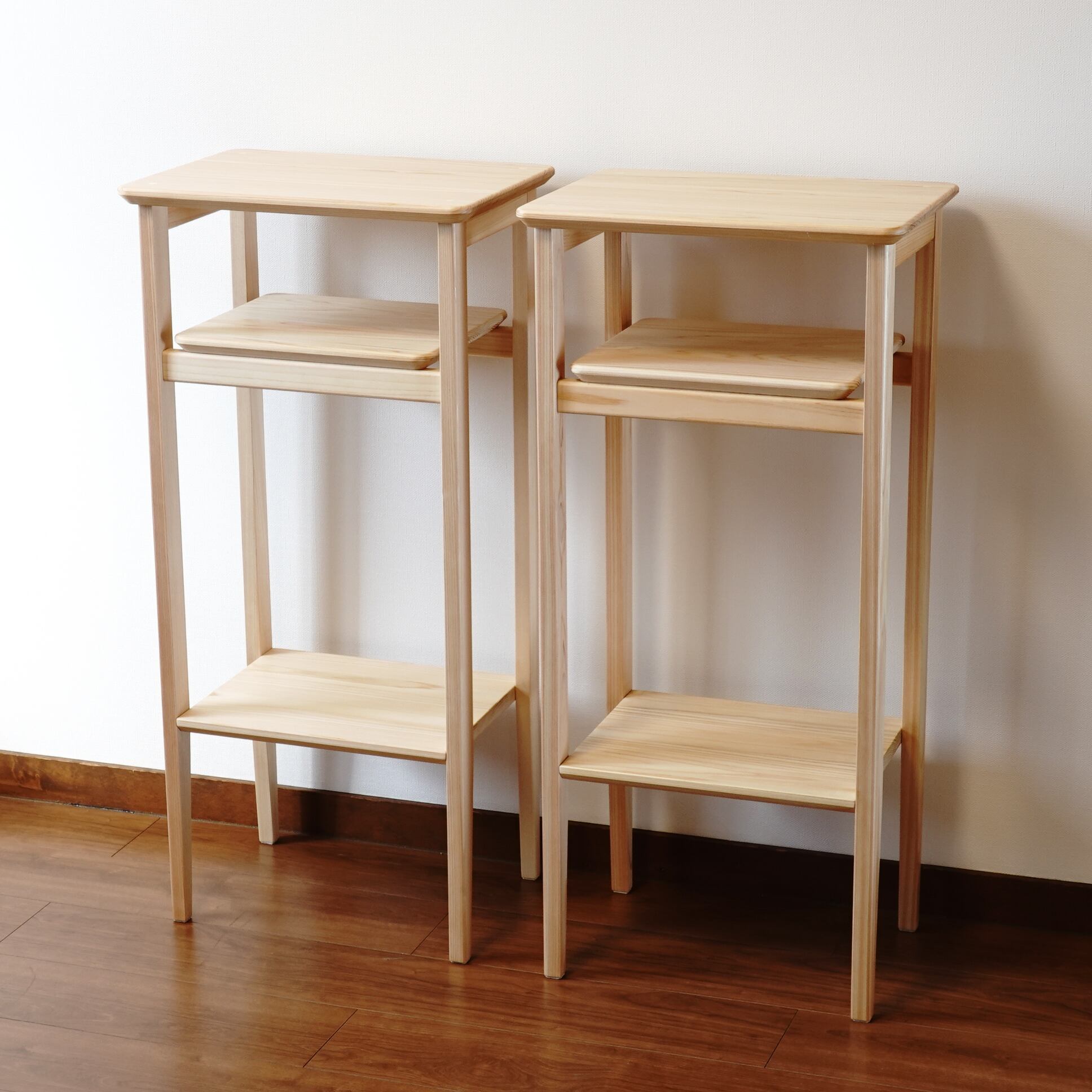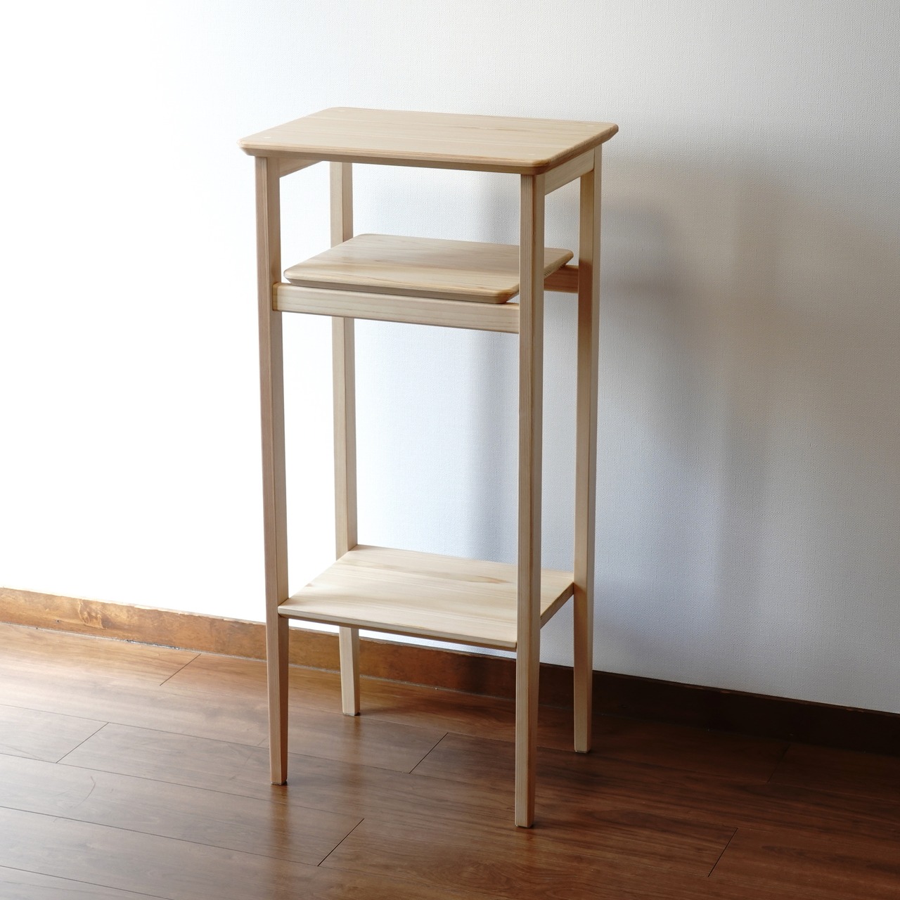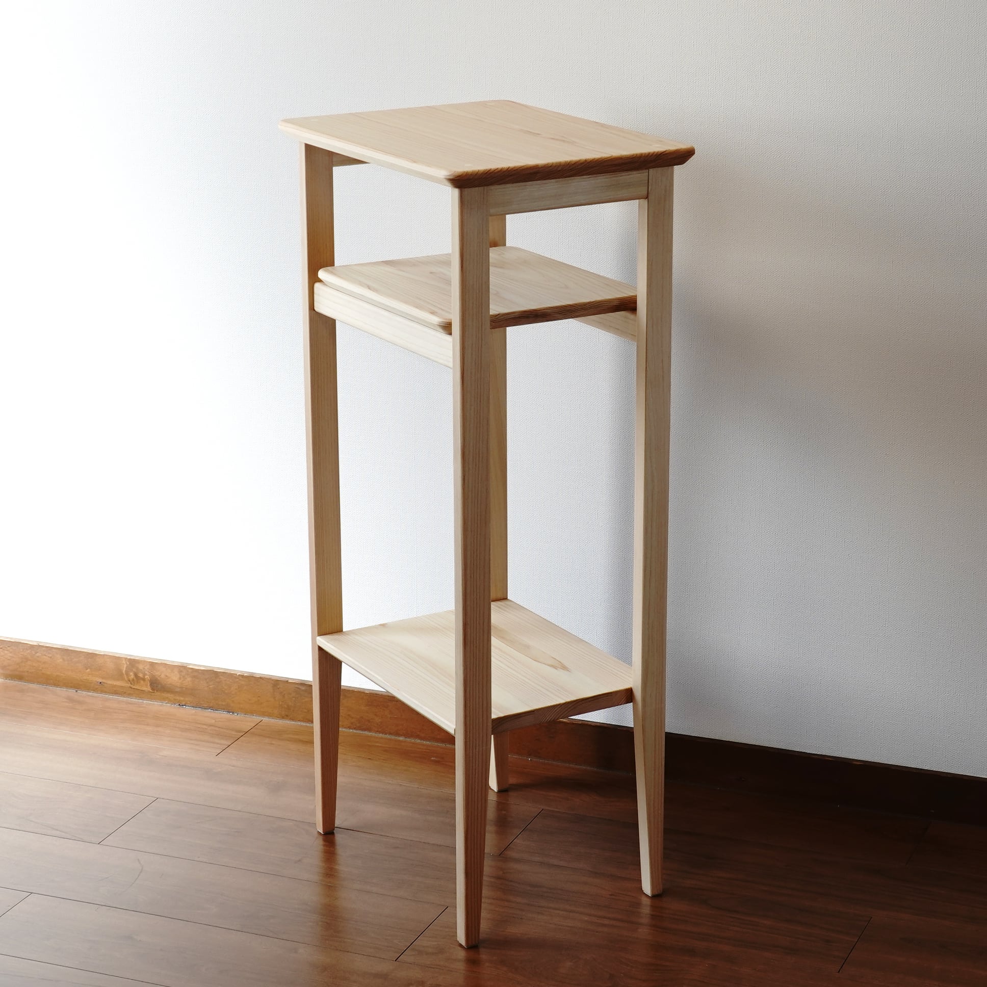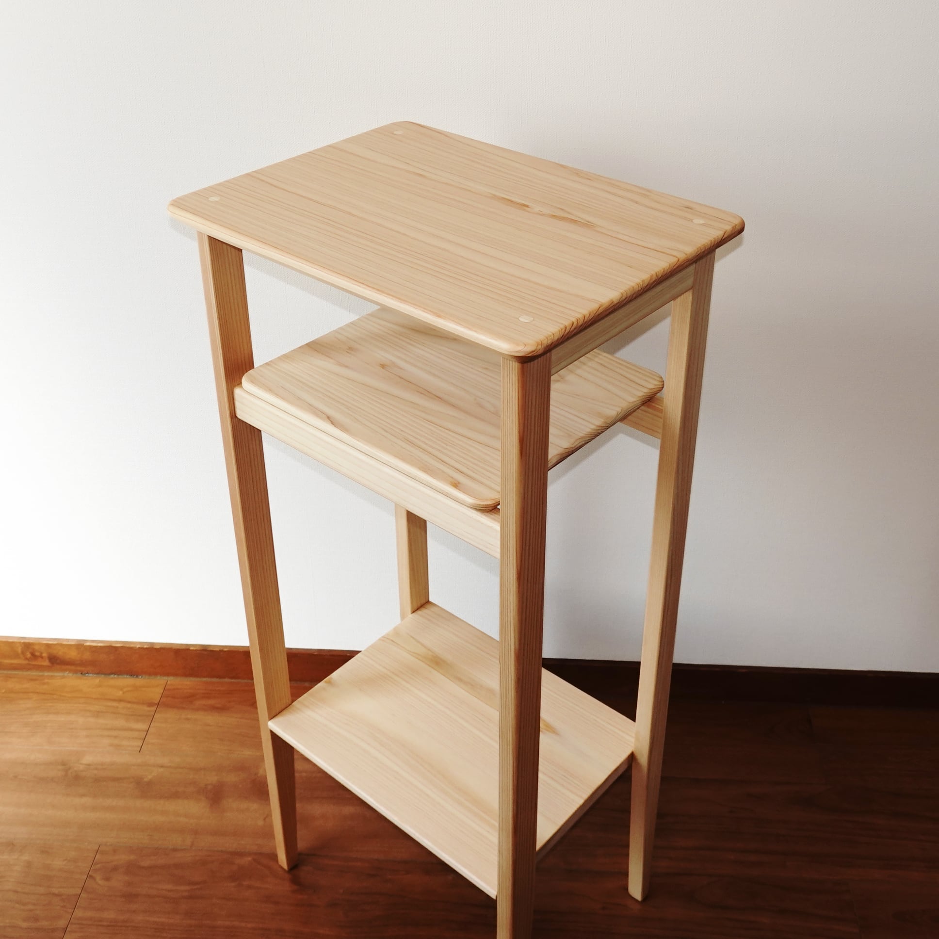 滋賀県高島市の森で育ったひのきから作った高さ85㎝の「サイドテーブル」(完成品)です。